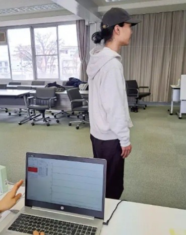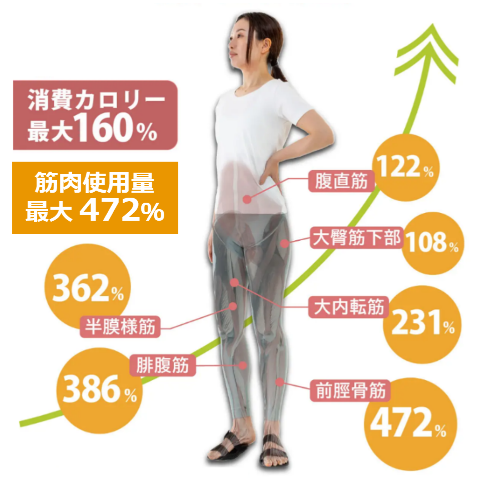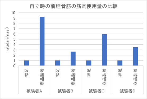 筋電計で腹直筋、大内転筋、前脛骨筋、腓腹筋、半膜様筋、大殿筋下部の6つの筋肉使用量を測定。裸足で自立時を1とし、商品装着状態で自立時の筋肉使用量の増加率を表した。被験者4名分の結果から最大値と最小値を除いた平均を使用。最も増加率が高いのが前脛骨筋の472%。