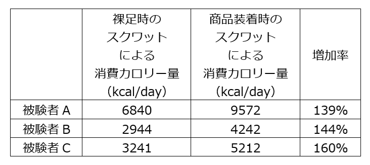 60秒間のスクワット運動を行い、運動中(60秒)および運動後の立位安静状態(60秒)の計120秒間の呼気代謝量を測定し、測定値よりエネルギー消費量を算出。裸足時と商品装着時の増加率は最大160%。