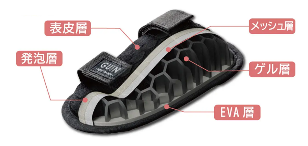 ・EVA層:土台部にあたり、底面を安定させます。また軽量で足に余分な負担がかかりません。
