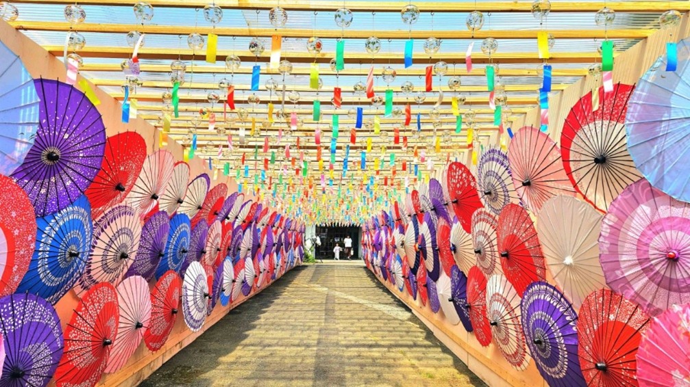 関ヶ原ウォーランド内に約400本の和傘を演出展示しており、一部は風鈴まつりと合わせた展示をしています。今年は屋内展示を2か所に増設。屋内展示では日中もライトアップしています。