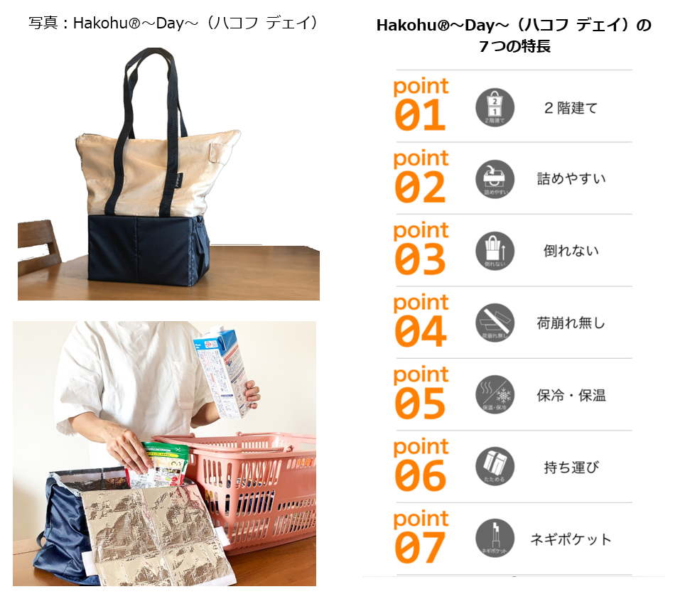 ノベルティ・プレミアム・OEM商品の企画・製作を手掛け、累計3,800アイテムの制作実績がある株式会社サン・リット企画(本社:名古屋市)は、2024年に箱型構造の自立型で容量約27リットルの大容量折り畳み式買い物バッグ「Hakohu(R)(ハコフ)」を開発し販売しました。その中で消費者から「日常的な買い物で使えるコンパクトなバージョンが欲しい」という要望を受けました。そこでこのたび、主に一人・二人暮らしの方の日常的な買い物(買い物かご半分程度、容量約14リットル)向けの買い物バッグ「Hakohu(R)~Day~(ハコフ デェイ)」を開発し、販売開始します。7つの特長(1.独自の二階建て構造、2.商品を詰めやすい、3.倒れにくい、4.荷崩れしにくい、5.保冷・保温性、6.コンパクトに畳める、7.ネギポケット)を備えています。2025年10月2日(木)15:00〜11月30日(日)22:00まで、Makuakeでプロジェクトを公開します。