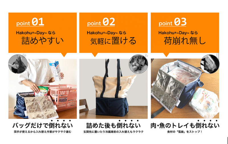 ・前バージョンのHakohu(R)発売当初はアルミ蒸着生地がはがれやすかったため、丈夫なアルミ蒸着生地に変更して耐久性が向上しました。